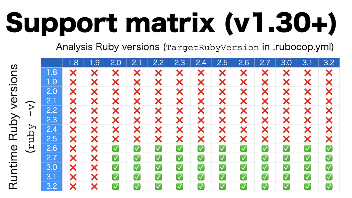 最後に付録的に書いている Ruby と RuboCop のサポートマトリックスは当初今年の RubyKaigi 2022 向けに作って入れていたものだったものの、ストーリーの流れで外したスライド。今回少し強引ではあるものの流れで伝えられそうなので足し込んでおいた。ついでに言うと、表紙パロディの元ネタである『Ruby のしくみ』のサブタイトルは『An Illustrated Guide to Ruby Internals』で、図を使った説明を意識してされていたことから、今回の私の発表は図を多めにと意識していたので、このマトリックスも入れてしまおうといった部分もある。